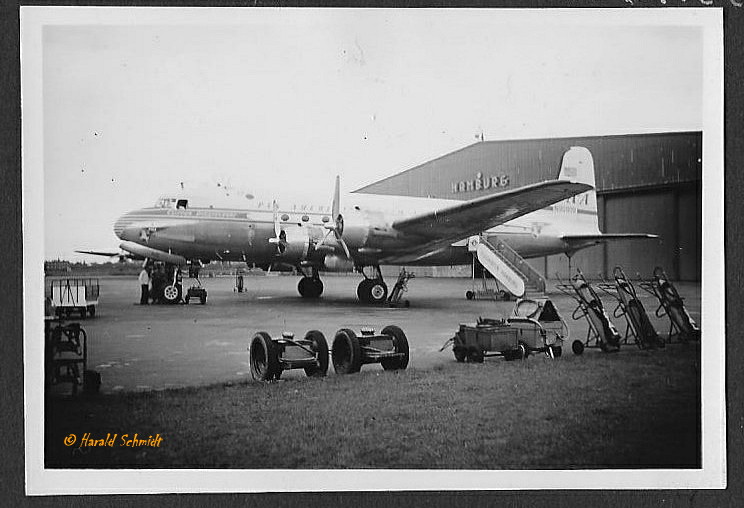 Vorfeldabfertigung auf dem Flughafen HH-Fuhlsbüttel, ca. 1956/57, mit DC 3 und DC 4