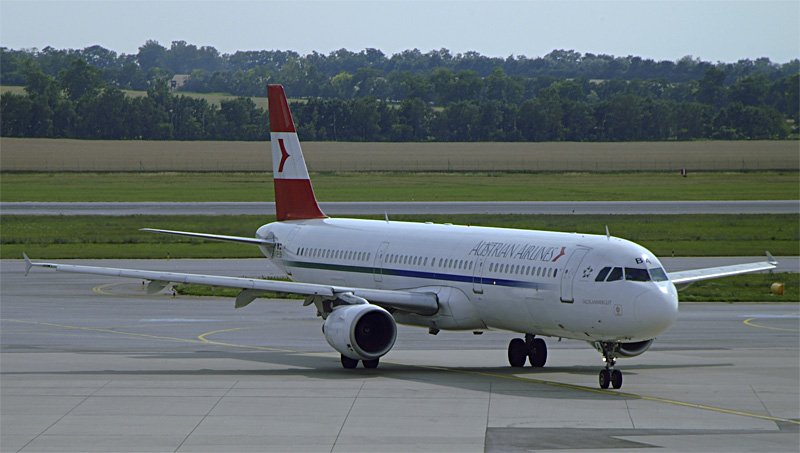 Austrian A321-111 ist soeben in Wien Schwechat eingetroffen und rollt zur Parkposition! Aufnahme vom 16.7.2005