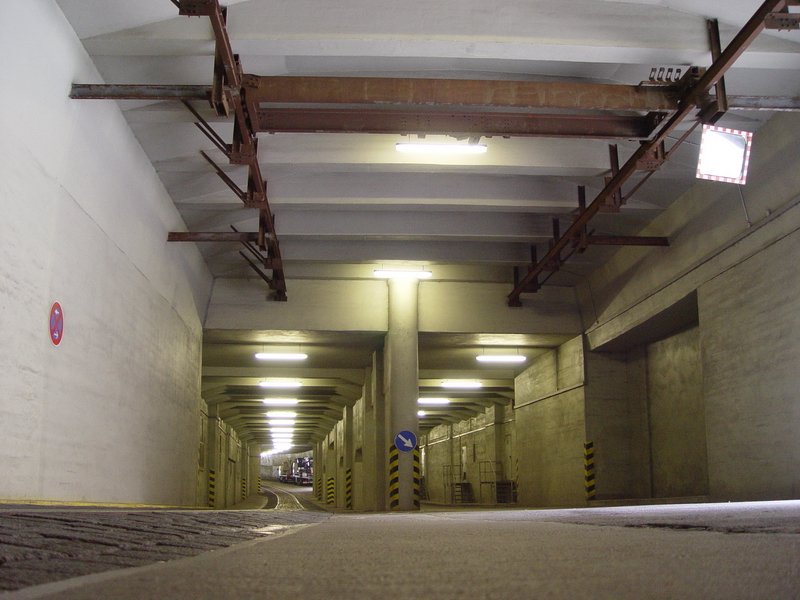 Flughafen Tempelhof. Der Eisenbahntunnel unter dem Flughafengebäude/Gelände. Die etwas angerostete Stahlkonstruktion an der Decke ist die einzige original erhaltene Krananlage aus dem 2. Weltkrieg als hier Jagdflugzeuge montiert wurden. (9.7.2005) Reinhard Korsch