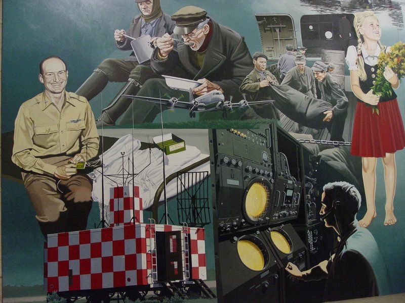 Flughafen Tempelhof. Eine Wandzeichnung beschreibt die Zeit der Berliner Blockade. Links der "Vater" der Süßigkeiten-Fallschirme Gail Halvorsen. Unten, eine mobile Leitstelle und und ein Fluglotse. (9.7.2005) Reinhard Korsch