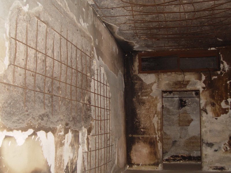 Flughafen Tempelhof. Russische Streitkräfte erreichten als erste das nur wenig zerstörte Flughafengelände (strategisches Interesse!). Bei der Durchsuchung des Gebäudes stieß man auch auf schwer gesicherte Kellerräume. Die wurden kurzerhand aufgesprengt. In den Räumen lagerte Nitro-Filmmaterial. Dieses wurde explositionsartig in Brand gesetzt. Die verheerende Wirkung des Feuers ist gut an den Betonwänden dieses Raumes zu sehen. (9.7.2005) Reinhard Korsch