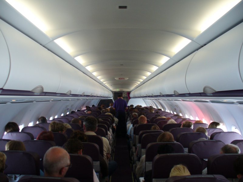 Innenraumansicht der Maschine von Wizzair beim Flug in Richtung Danzig.