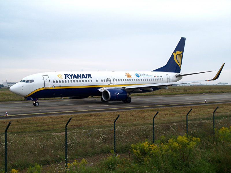 Eine Boeing 737-800 der Ryanair nach der Landung auf dem Flughafen Lübeck Blankensee am 27.09.08