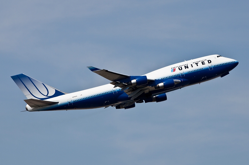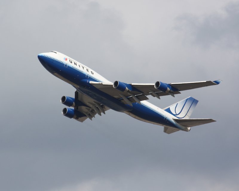 Eine Boeing 747-400; Kennung N18OUA von UNITED AIRLINES startet am 02.09.2009 von Frankfurt/Main Flughafen.