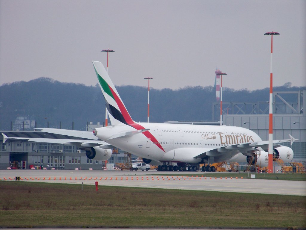 Emirates, A380-842, A6-EDK auf dem Weg zum Flughafen Finkenewerder auf ungefähr 4000 Fuß. Aufgenommen am 21.2.10.