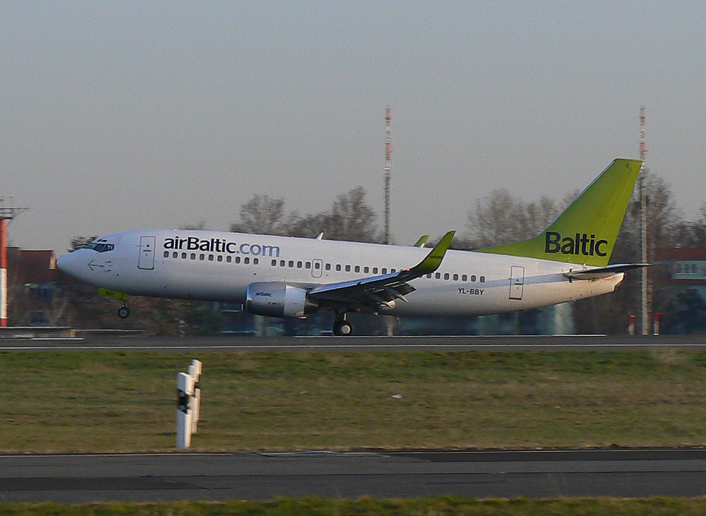 Air Baltic B 737-26Q YL-BBY bei der Landung in Berlin-Tegel am frühen Morgen des 02.04.2010