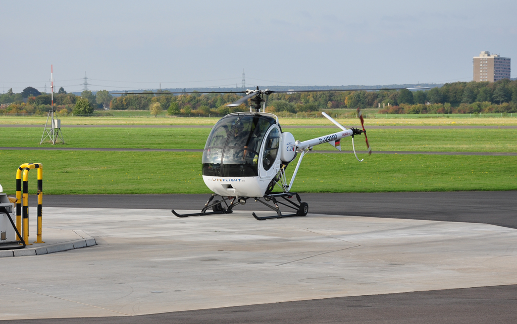 Schweizer-Hughes 300 CB in leichter Schräglage nach dem Abheben von der Tankstelle in Bonn-Hangelar - 08.10.2010