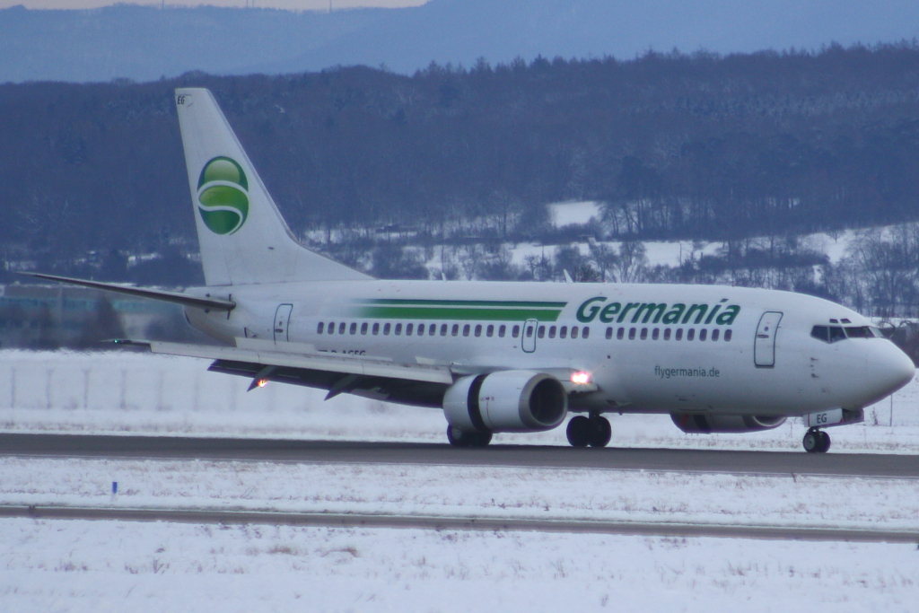 Die Germania-Boeing 737-35B D-AGEG landet in Stuttgart-Echterdingen am 18.12.10. Diese Registration trug im Jahr 2003 eine Germania 737-300, 2006 eine dba-Boeing 737-35B, danach eine Boeing 737-35B von TUIfly und jetzt wieder eine Germania-Maschine.