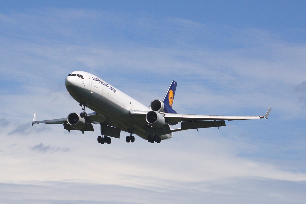 Eine Lufthansa Cargo MD 11F am 05.09.2010 über dem Flughafen Berlin-Tegel