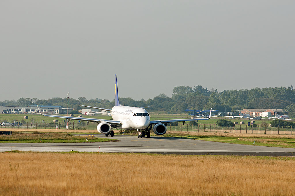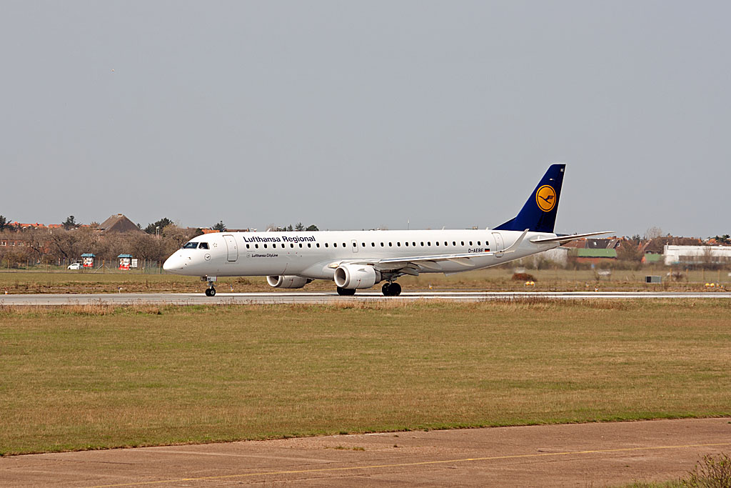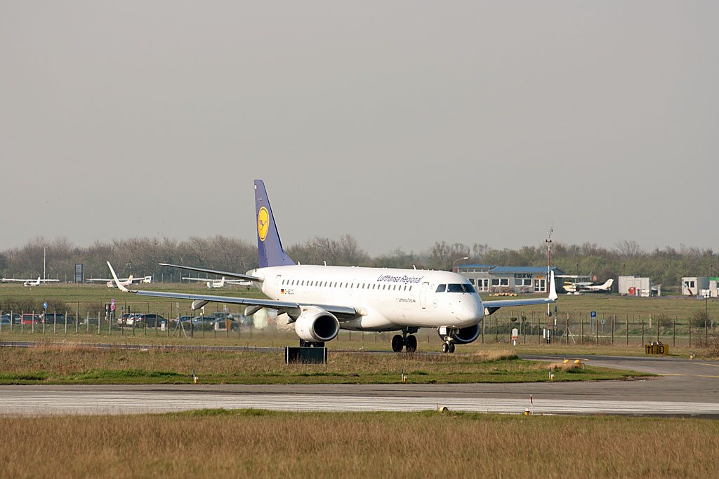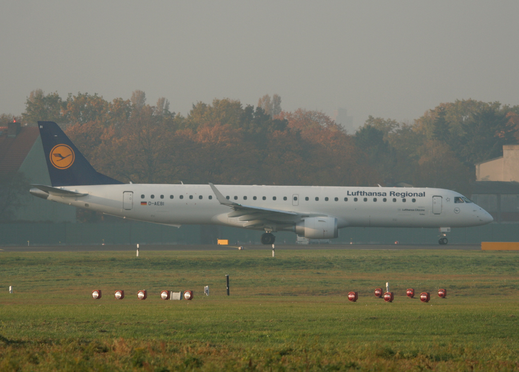 Lufthansa Regional(CityLine) Embraer ERJ-195LR D-AEBI kurz vor dem Start in Berlin-Tegel an einem sehr trüben Morgen des 29.10.2011