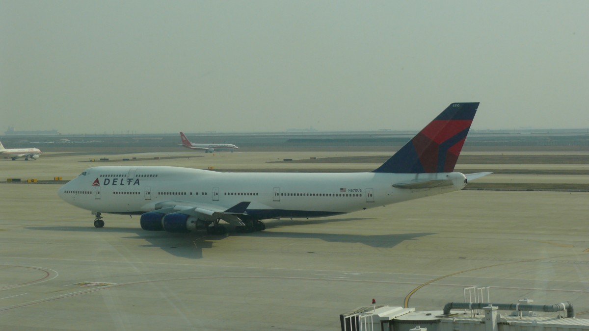 Boeing 747-400 von Delta mit der Kennung N67OUS am 27.3.2011 in Shanghai. Dieses Bild habe ich aus meinem Flieger gemacht