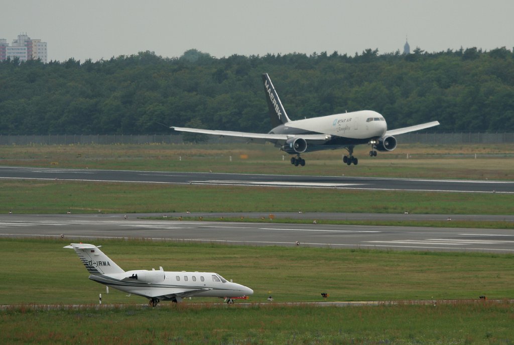 Star Air B 767-204(BDSF) OY-SRH bei der Landung in Berlin-Tegel am 03.07.2012. Die Triple Apha Cessna 525 Citation CJ 1 D-IRMA mußte warten.