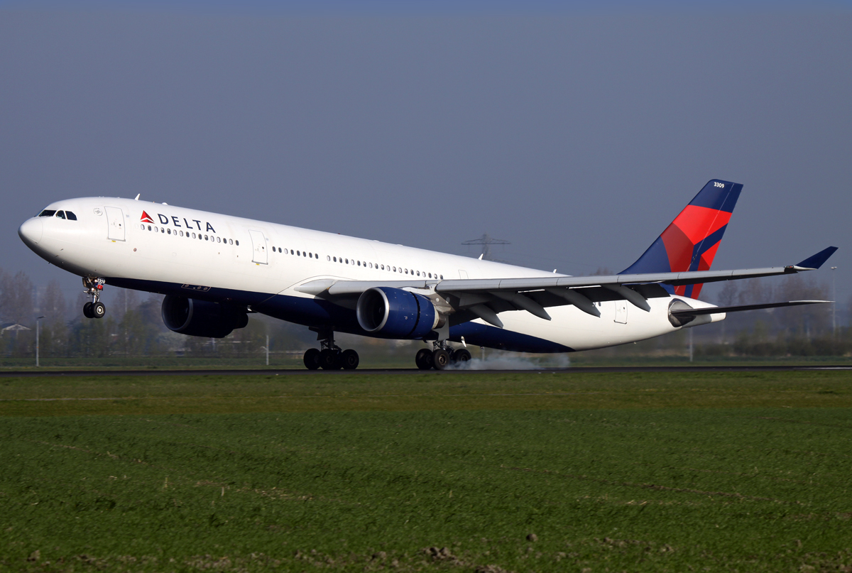 Delta A330-300 N3309 beim Touchdown auf 18R in AMS / EHAM / Amsterdam am 05.05.2013