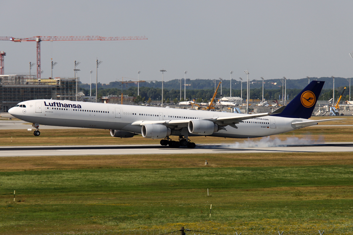 Lufthansa A340-600 D-AIHT beim Touchdown auf 08L in MUC / EDDM / München am 23.07.2013