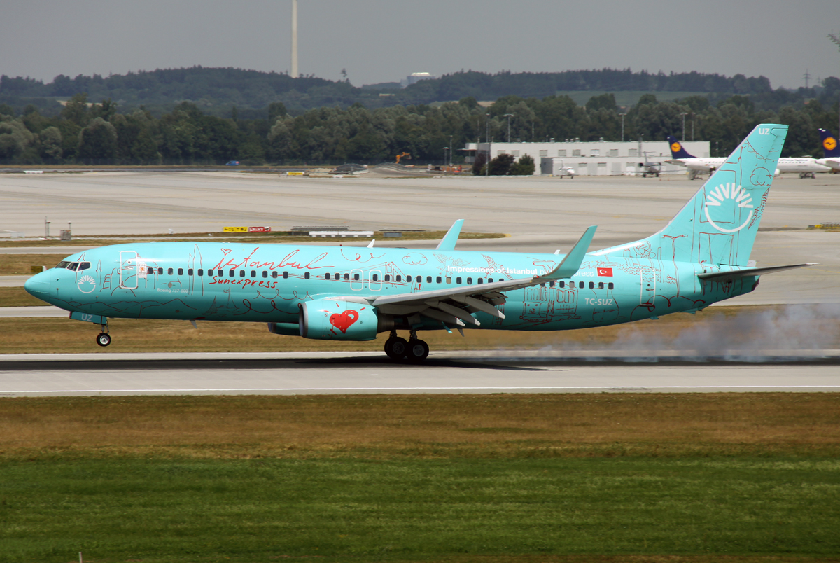 Sunexpress Istanbul B737-800 TC-SUZ beim Touchdown auf 08L in MUC / EDDM / München am 23.07.2013