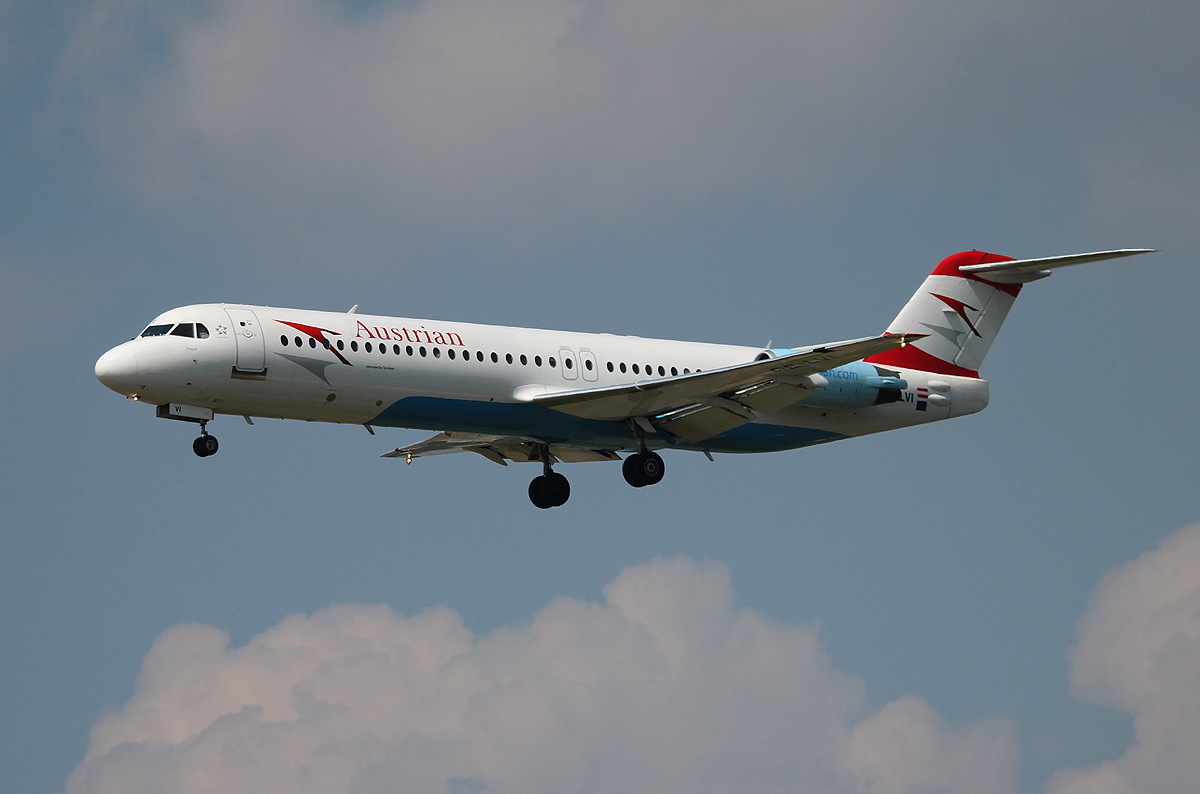 Austrian Airlines Fokker 100 OE-LVI bei der Landung in Frankfurt am 11.06.2013