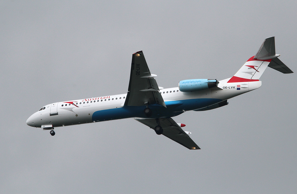Austrian Airlines Fokker 100 OE-LVK bei der Landung in Frankfurt am 09.06.2013