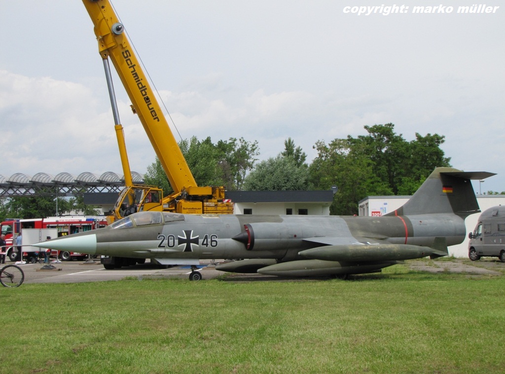 Lockheed F-104G „Starfighter“ 20+46, ehemaliger Jagdbomber der Bundeswehr. Die F-104G steht auf dem Gelände der Pfälzer Flugzeugwerke (PFW) in Speyer. Aufgenommen beim Tag der offenene Tür anläßlich des 100jährigen Bestehens der PFW in Speyer, 15.Juni 2013. Marko
