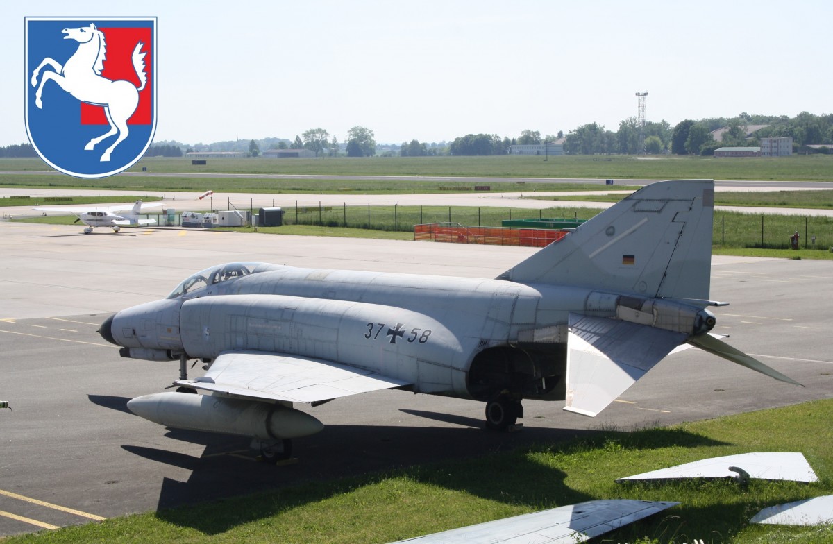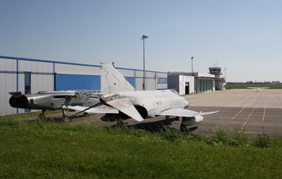 Phantom F-4F II des ehemaligen Jagdgeschwaders 72 "Westfalen" 37+58 der Luftwaffe hat sich zum Tornado-Fragment der 43+73 des AG 51 gesellt, Aufnahme vom 22.05.2014 auf dem Flughafen Neubrandenburg-Trollenhagen. Hier sind auch die fehlenden Teile des Tornado erkennbar, die bislang scheinbar in einer Halle lagen.
