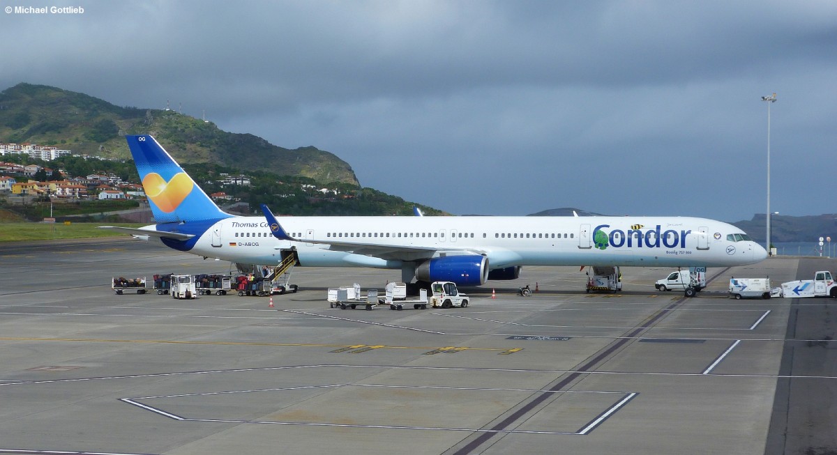 Auf der Besucherterasse vom Flughafen Funchal (FNC) auf Madeira mit D-ABOG | Boeing 757-300 (CONDOR / Thomas Cook) und dahinter die Ostspitze der Insel im Hindergrund (06.03.2014) Michael Gottlieb