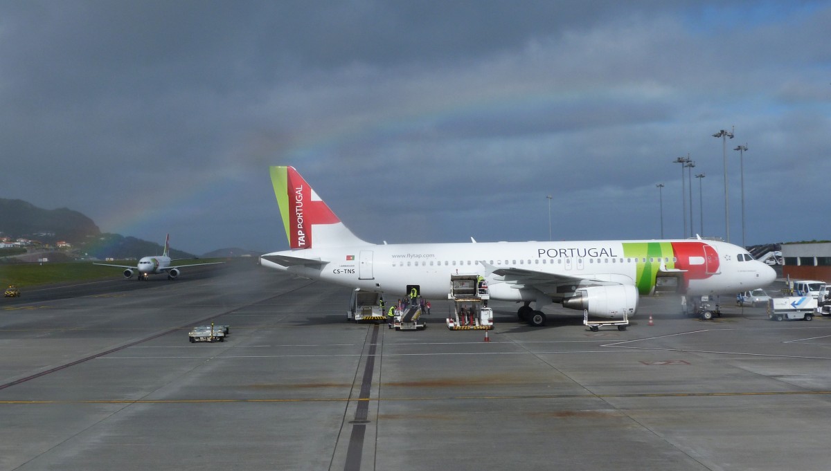 Der letzte Blick von der Treppe vor dem Einstieg in "unser" Flugzeug, dass uns nach 10 Tage Aufenthalt wieder nach DUS fliegt, auf CS-TNS | Airbus A 320-200 (TAP Portugal) mit Regenbogen - Flughafen Funchal (FNC) auf Madeira (06.03.2014) Michael Gottlieb
