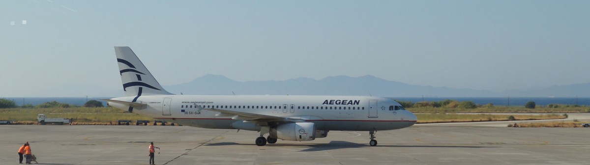 Airbus A 320 der Aegean Airlines (SX-DGK) auf Flug A3765 von Heraklion nach der Landung am Diagoras International Airport auf Rhodos (RHO) am 05.09.2015. Mark