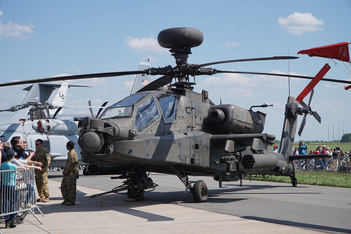 Boing AH-64 D Apache. Zweimotoriger Kampfhubschrauber der US Army. Entwickelt von Hughes Aircraft, heute produziert von Boing. Zwei General Electric Triebwerke T700-GE-701 mit je 1660PS (1238kW9 Leistung. Vmax 293km/h. Foto: ILA 2018 Reinhard Korsch