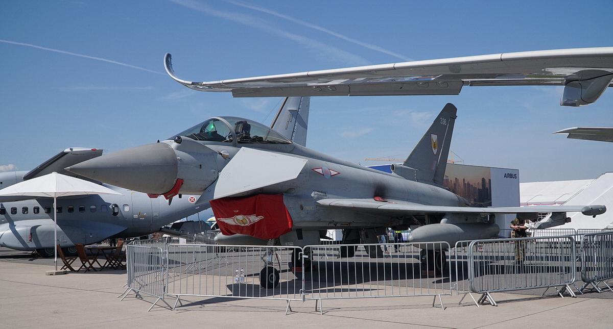 Eurofighter der Royal Air Force (336). Antrieb durch zwei Eurojet EJ200 Turbinen. Startleistung: Bremsen lösen und nach 8 Sekunden vom Boden abheben. Vmax Mach 2. Foto: ILA 2018 Reinhard Korsch