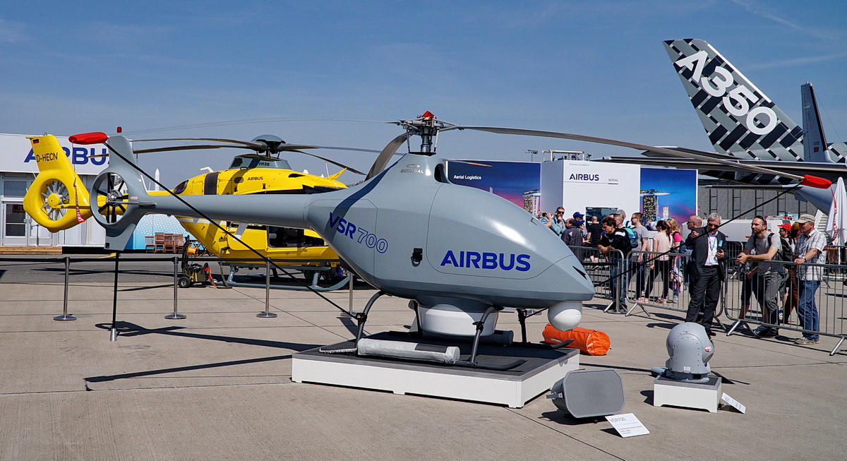 Airbus VSR 700. Hubschrauberdrohne von Airbus Helicopters für die französische Marine entwickelt. Antrieb durch einen Dieselmotor mit 155PS. Es wird eine Flugdauer >10 Stunden angstrebt. Vmax 187km/h. Foto: ILA 2018 Reinhard Korsch