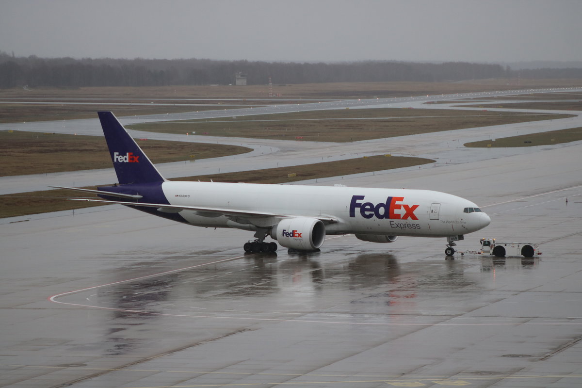 FedEx, Boeing B777-FS2, N885FD, parkt mit anderen Frachtflugzeugen vor den Frachthallen in Köln-Bonn (CGN/EDDK) am 24.11.2019.