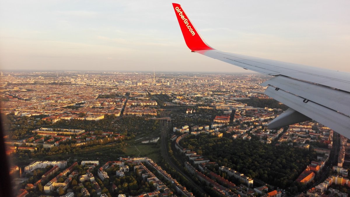 Die Skyline von Berlin mit Fernsehturm fotografiert aus einer Maschine von AirBerlin während des Anflugs auf den Flughafen Berlin Tegel (TXL) am 29.06.2016. Jonas Traub