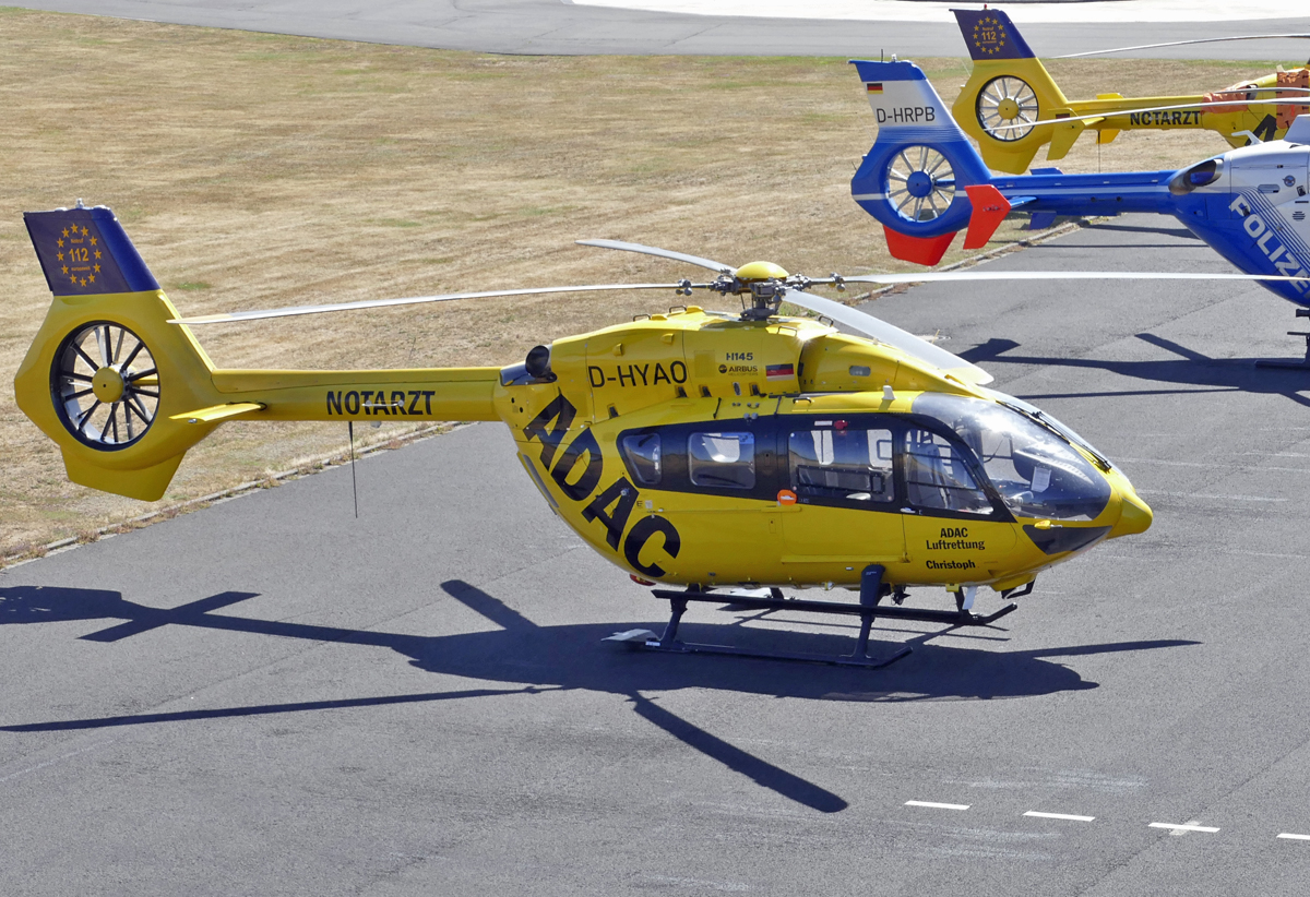 ADAC Hubschrauber vor der ADAC-Werft in Bonn-Hangelar: D-HYAF H145, D-HXCB und D-HDEC, beide EC-135 - 05.08.2020
