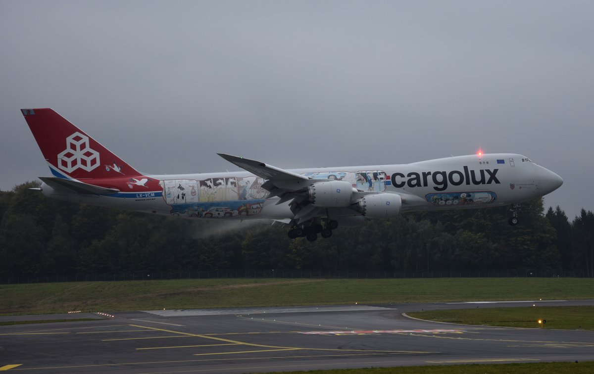 Boeing 747-8F LX-VCM mit Sonderbemalung landet bei schlechtem Wetter am 05.10.2017 auf Rwy 24 in Luxemburg.