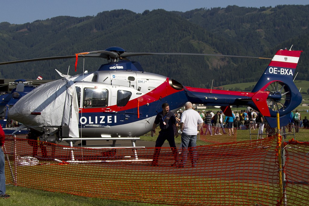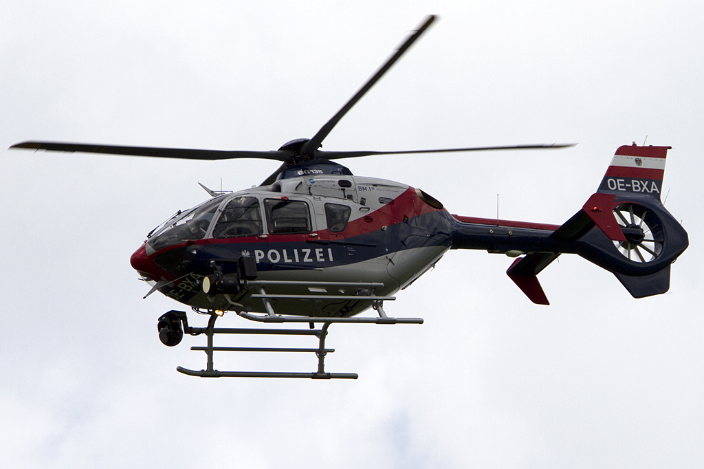 OE-BXR (Airbus Helicopters H135_EC135P3 Serial 2085) mit einem Wassersack anlässlich eines Brandes am 1557mtr. hohen Gartenzinken bei Bad-Ischl; 210621