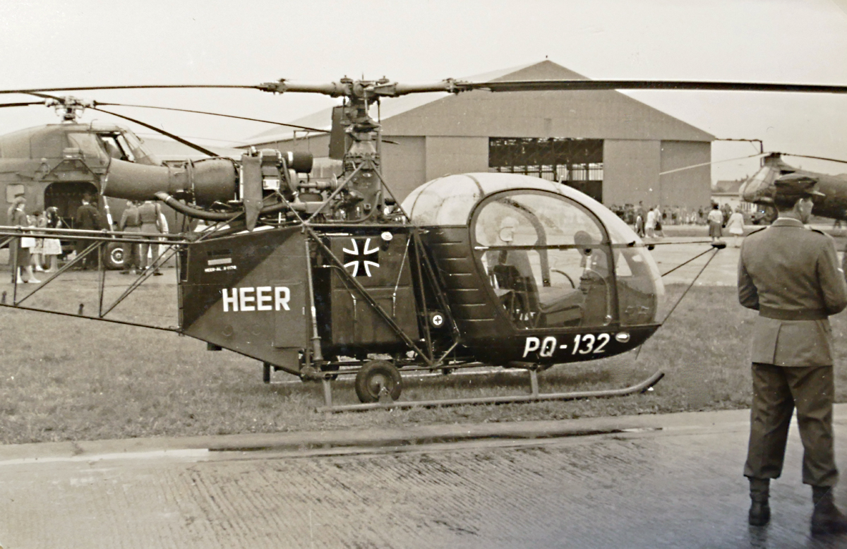 Oldie-Aufnahme vom Flugtag in Bückeburg, März 1960. Alouette II - PQ+132 der Heeresflieger. Dahinter links Sikorsky H 34 und rechts Vertol H 21 (Banane).