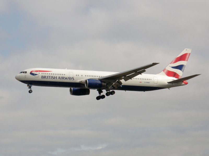 Boeing 767-336 der British Airways (G-BNWA) bei der Landung in Frankfurt am Main am 16.07.2008.