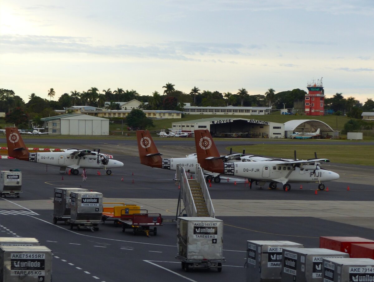 Fiji Link, DHC-6 Twinotter, DQ-FJR, DQ-FJS und DQ-FJQ auf dem Vorfeld in Nadi (NAN/NFFN), 14.8.2025