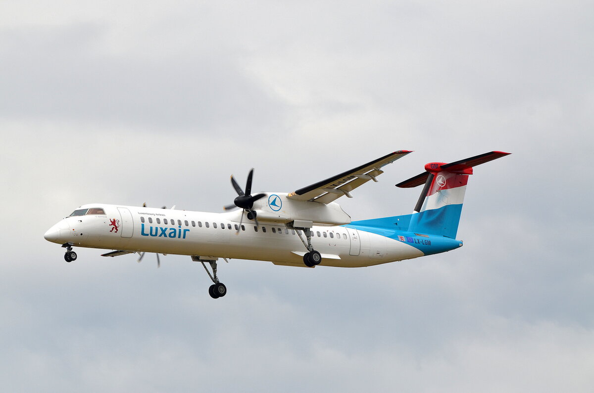 Luxair, LX-LQI, de Havilland, DHC-8Q-402, auf dem Rollfeld des Flughafens von Luxemburg. 16.06.2025
