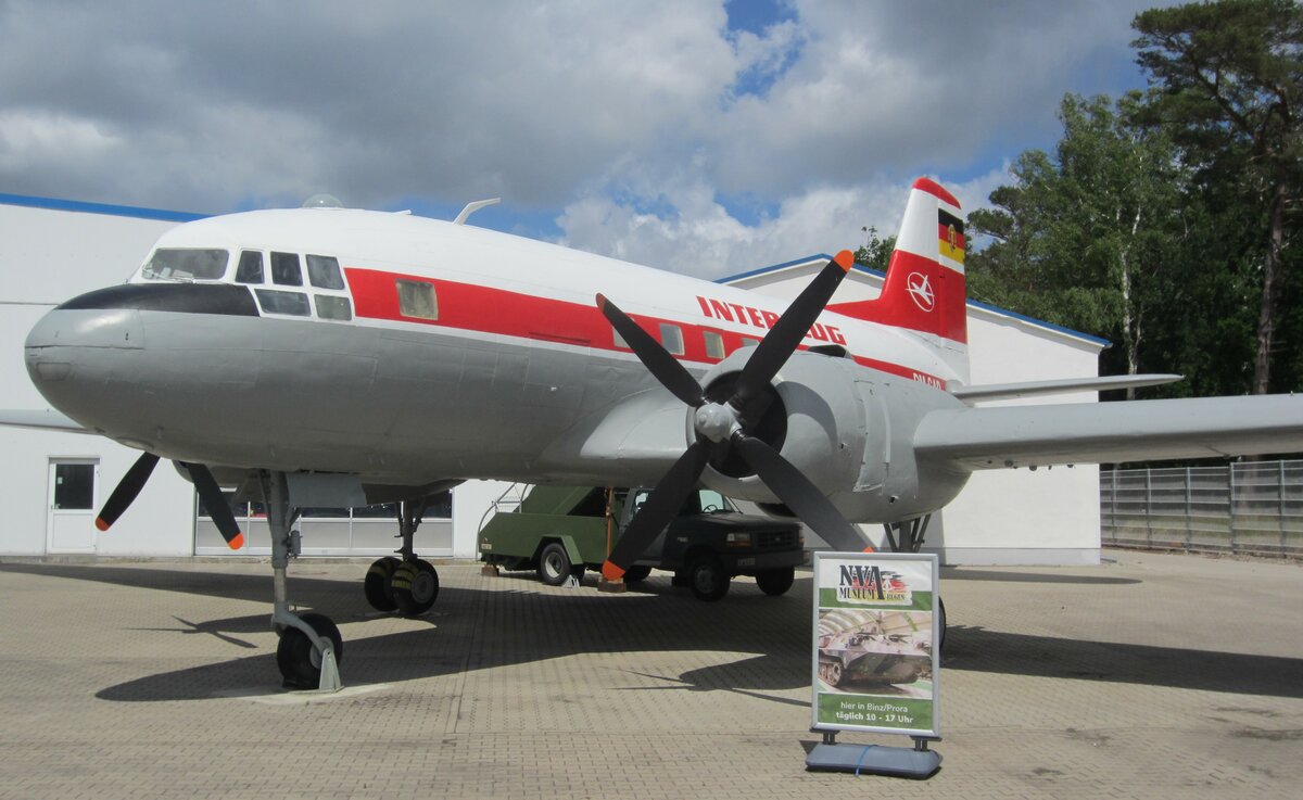 Diese 1957 in Dresden gebaute IL-14P flog als SP-LNG bei der polnischen Fluggesellschaft LOT. Heute trägt sie die Bemalung der einstigen DM-SAD der Interflug. Aufgenommen am 27.06.2023 im Freigelände des Oldtimermuseums Prora auf Rügen.