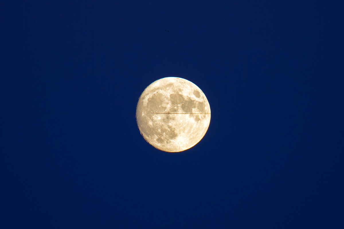 Ein Flugzeug kreuzt die Flugbahn des aufgehenden Mondes. - 12.12.2016