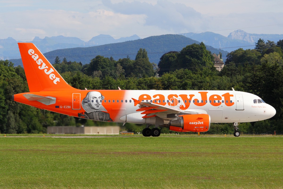 easyJet, G-EZBI, Airbus A319-111, 9. August 2014, GVA Genève, Switzerland. Mit Sonderbemalung: "William Shakespeare, Romeo Alpha Juliet".