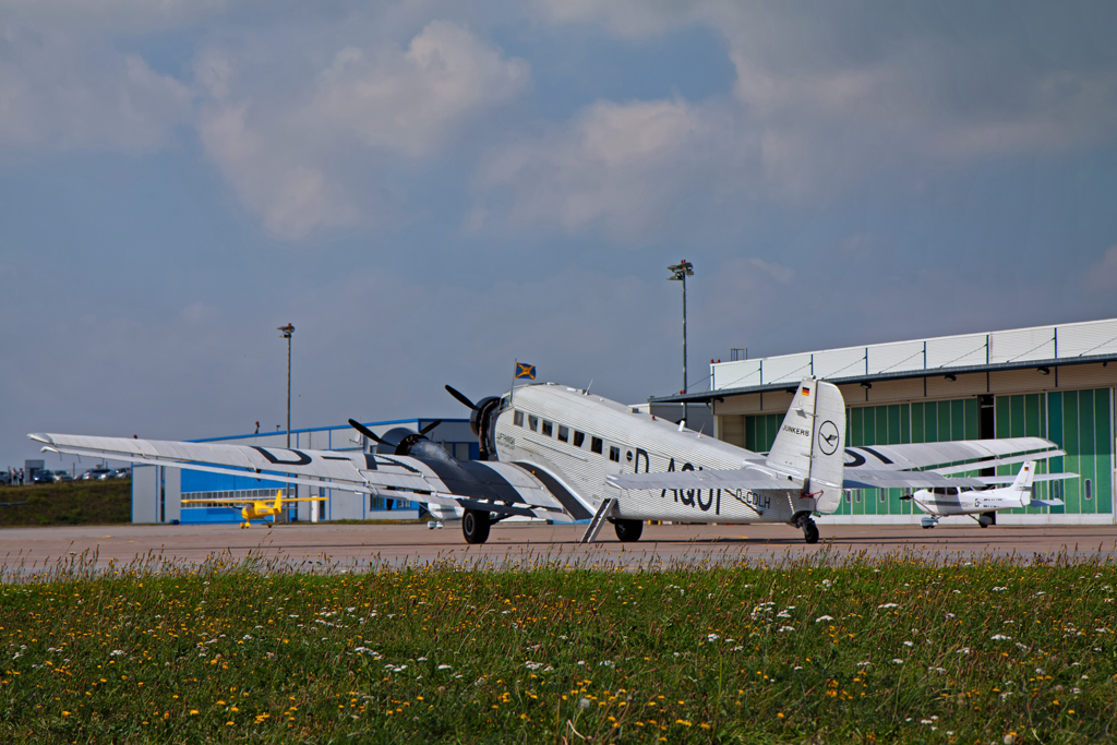 JU 52 D-AQUI steht vor dem Flughafen Terminal in Neubrandenburg-Trollenhagen - 25.08.2012