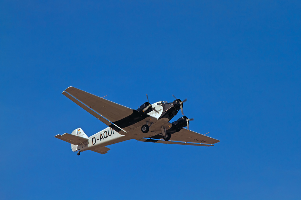 Tante JU ( Junker-52 D-AQUI) auf Rundflug über dem Inselflughafen Heringsdorf.