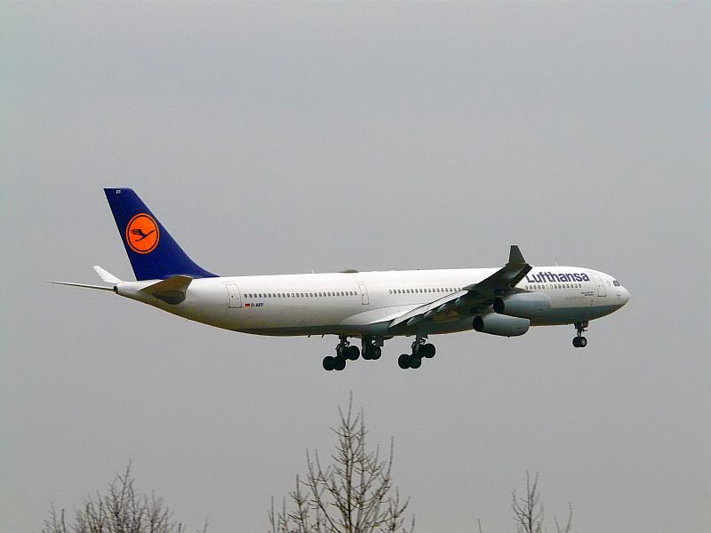 Bei ein bisschen Sonne gleitet der A340 der Lufthansa auf die 05R in Düsseldorf zu. Das Bild stammt vom 01.03.2009