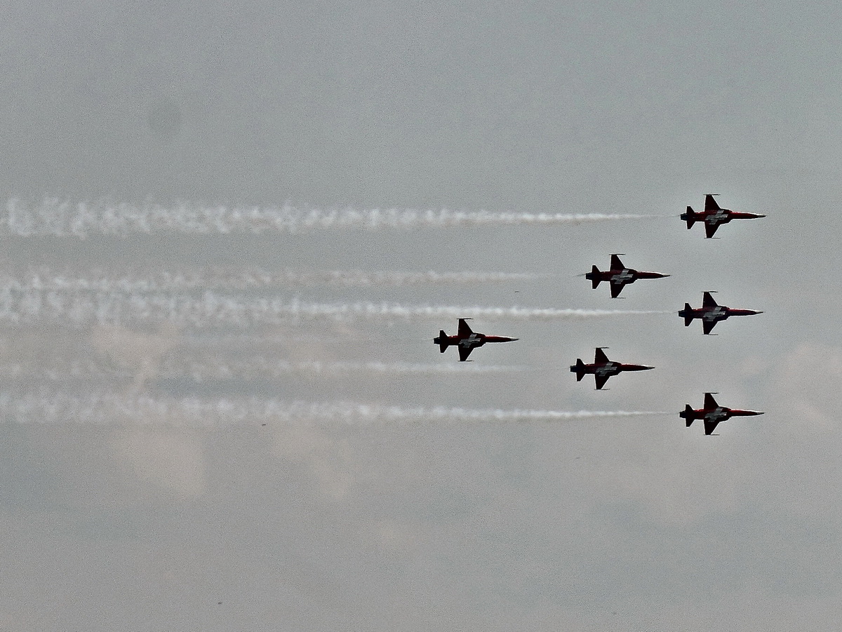 Patrouille Suisse bei einer Ihrer Vorführungen mit 6x Northrop F-5E Tiger II, gesehen von Schönefeld am 03. Juni 2016.
