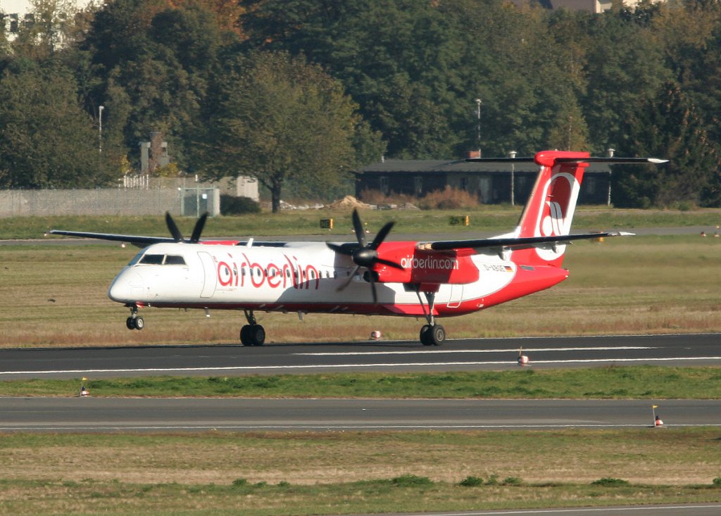 Air Berlin De Havilland Canada DHC-8-402Q D-ABQE bei der Landung in Berlin-Tegel am 15.10.2011