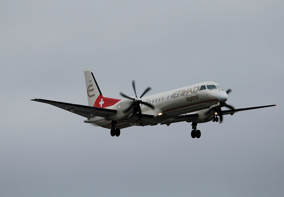 Etihad Regional Saab 2000 HB-IZW bei der Landung in Berlin-Tegel am 29.11.2015