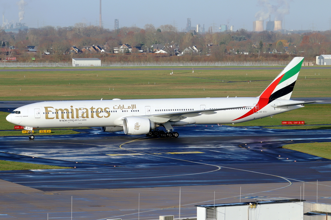 Emirates Boeing 777-31HER A6-EGJ rollt zum Gate in Düsseldorf 30.12.2025
