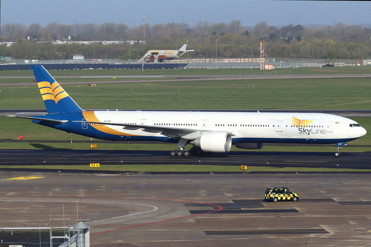 SkyLine Express Boeing 777-31HER UR-AZR rollt zum Gate in Düsseldorf 29.3.2026