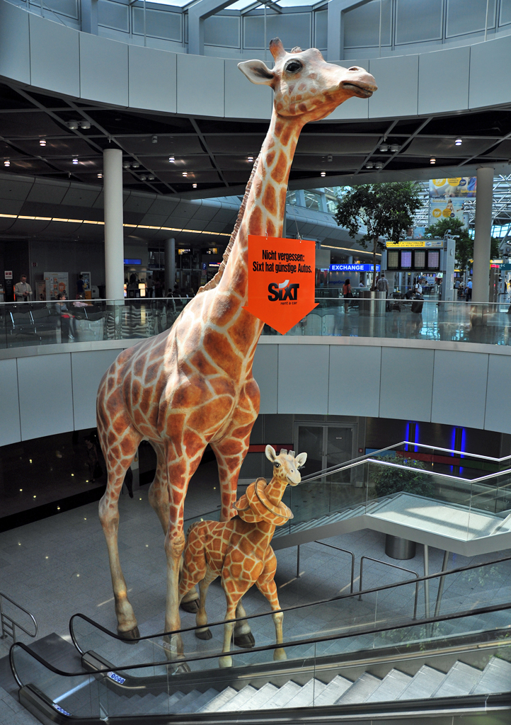 Giraffen in Originalgröße als Werbung für Leihwagenfirma im Terminal am Flughafen Düsseldorf - 24.07.2012